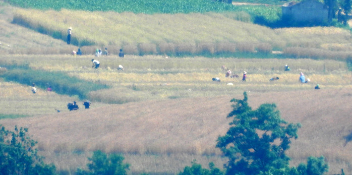 North Korean residents harvest barley at a field in Kaepung on the western front-line border with South Korea, in this photo taken from an observatory on Ganghwa Island in Incheon, west of Seoul, on June 12, 2025. North Korea appears to have paused its broadcasts of loud noises toward South Korea, the South's military said, a day after Seoul suspended its yearlong anti-Pyongyang broadcasts along the border. (Yonhap)