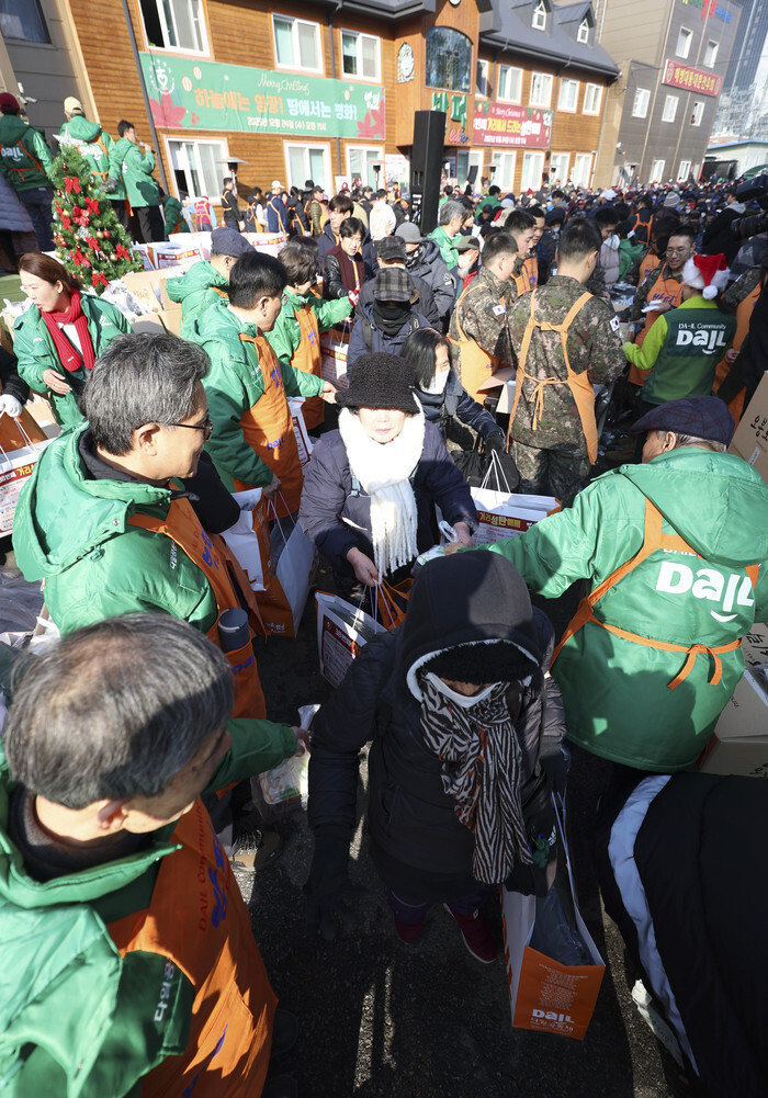 Volunteers from the relief group Dail Community give away meals and necessities to impoverished people in a street worship for Christmas in Seoul on Dec. 24, 2025. (Pool photo) (Yonhap)