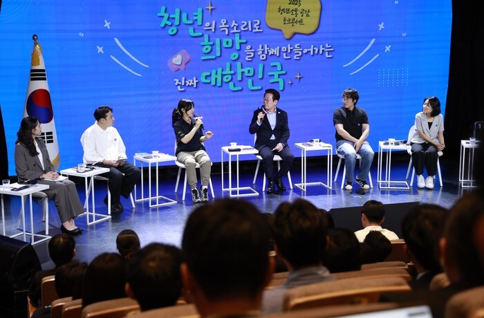 President Lee Jae Myung (4th from L) attends a talk show with a group of youths in their 20s and 30s at a theater in Seoul's Mapo Ward on Sept. 19, 2025. (Pool photo) (Yonhap)