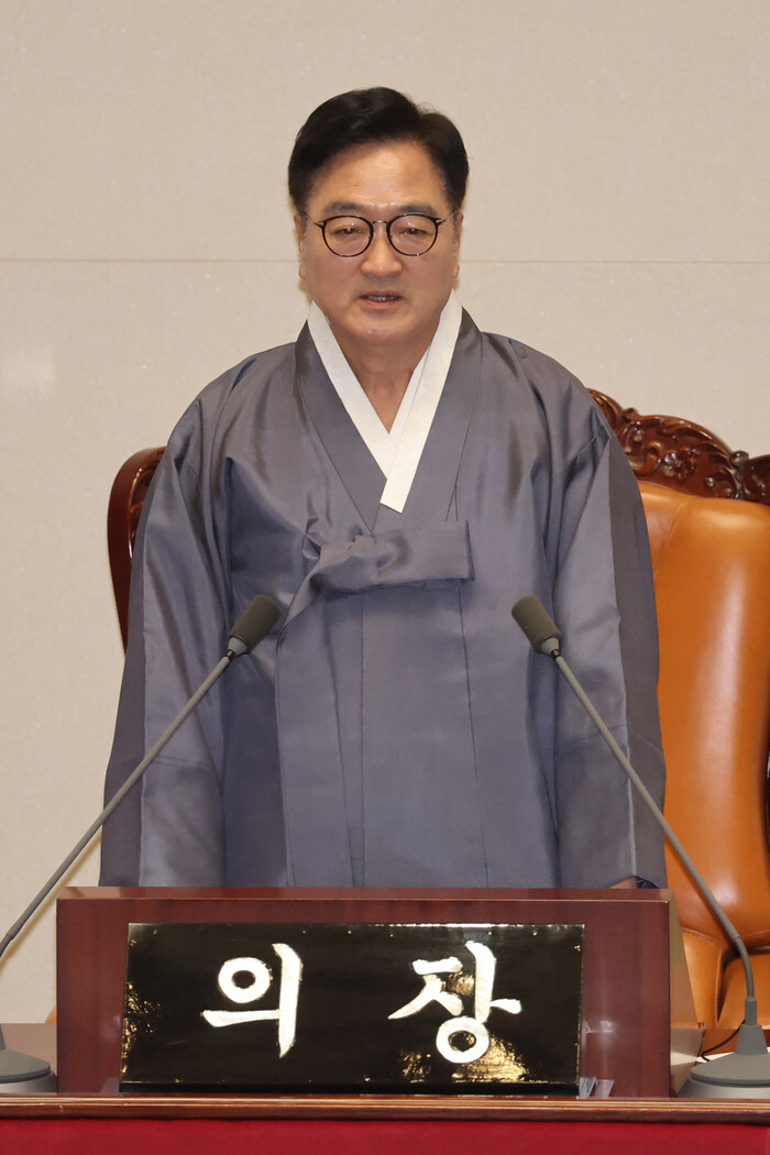 National Assembly Speaker Woo Won-shik, clad in traditional Korean clothing "hanbok," speaks during a plenary session at the parliamentary building in Seoul in Sept. 1, 2025, as South Korea's parliament began a 100-day regular session the same day. (Yonhap)