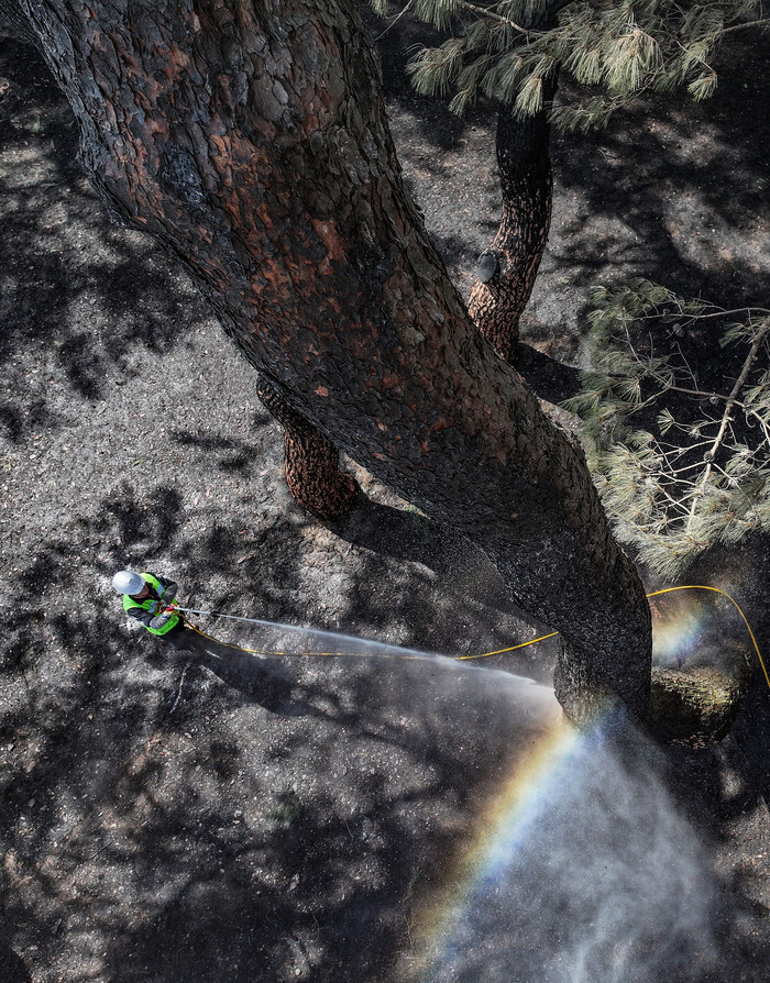 A worker of an arboreal treatment company cleanses a burnt pine tree in Andong, North Gyeongsang Province, southeastern South Korea, on March 31, 2025, after a massive wildfire hit the region. (Yonhap)