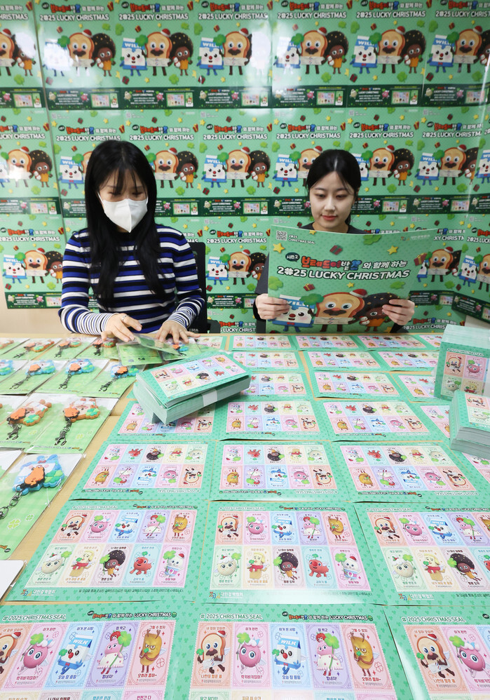 Employees of the Gyeonggi branch of the Korean National Tuberculosis Association show the 2025 Christmas seals in their office in Suwon, south of Seoul, on Nov. 24, 2025. (Yonhap)