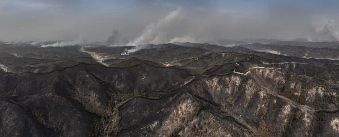 This photo, taken March 25, 2025, shows smoke rising from a wildfire (top) on a mountain in Andong, North Gyeongsang Province, southeastern South Korea, after it ravaged mountains (below) in the province's Uiseong. (Yonhap)