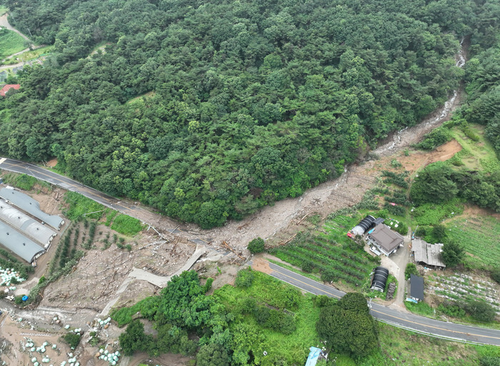A road is covered with earth and rocks brought by a nearby landslide in a village in Yesan, South Chungcheong Province, central South Korea, on July 17, 2025, following torrential rains that hit the region. (Yonhap)