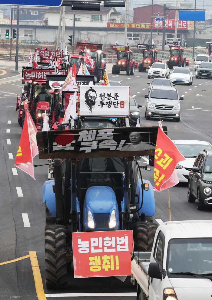 Members of the National Federation of Farmers, known as Junnong, particularly from the progressive Jeolla provinces, drive their tractors and trucks through Pyeongtaek, about 65 kilometers south of Seoul, on Dec. 20, 2024, as they head toward Seoul to demand the arrest of President Yoon Suk Yeol over his brief declaration of martial law. (Yonhap)