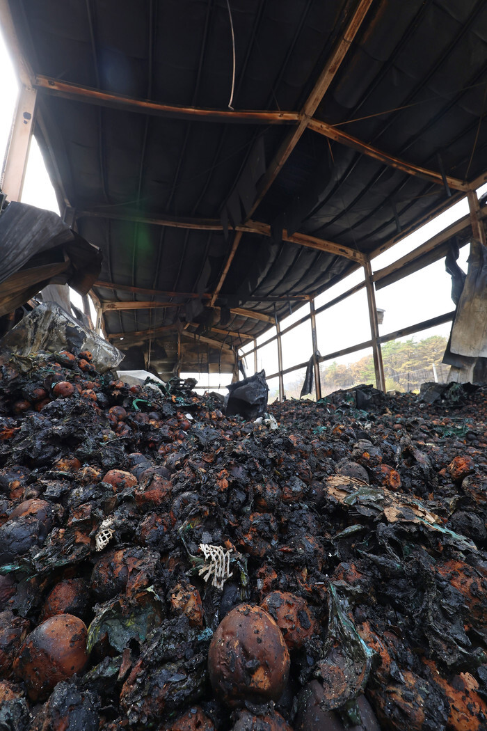 Burnt apples are seen at a gutted warehouse in a village in Uiseong, North Gyeongsang Province, southeastern South Korea, on March 25, 2025, after a wildfire ripped through the region. (Yonhap)