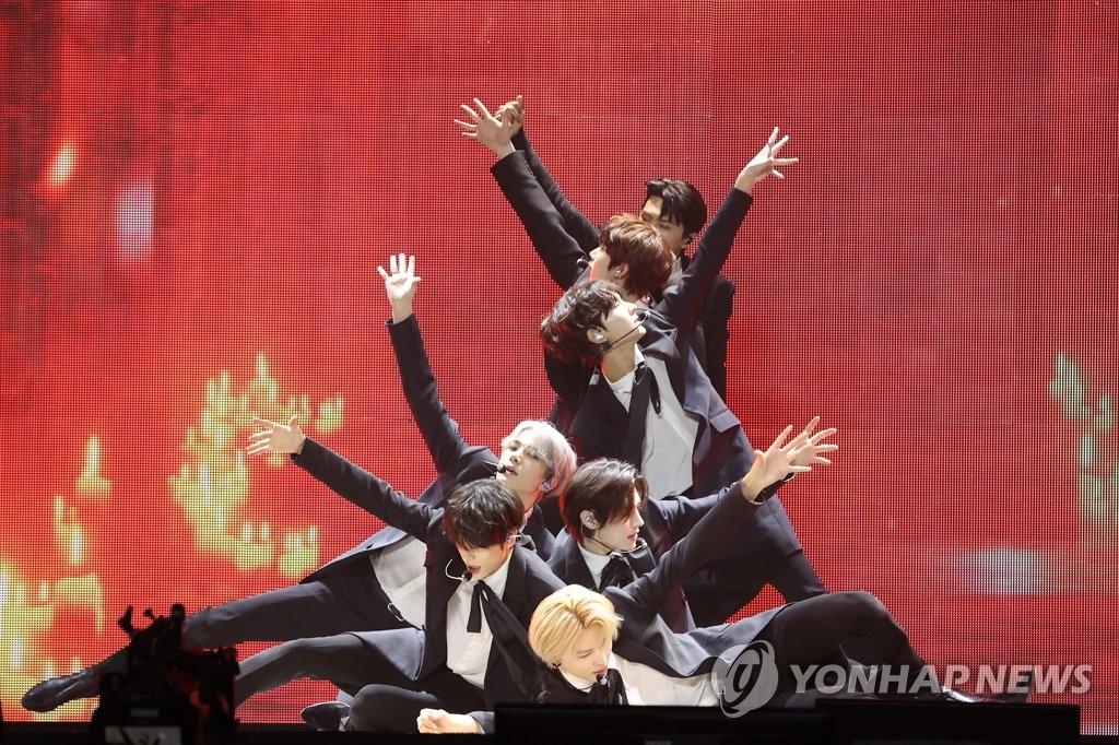 | ▲ 가요계로 돌아온 엔하이픈 (서울=연합뉴스) 강민지 기자 = 그룹 엔하이픈(ENHYPEN)이 22일 오후 서울 성북구 고려대 화정체육관에서 열린 네 번째 미니앨범 '다크 블러드(DARK BLOOD)' 발매 기념 미디어 쇼케이스에서 타이틀곡 '바이트 미'(Bite Me) 무대를 선보이고 있다. 2023.5.22 mjkang@yna.co.kr |