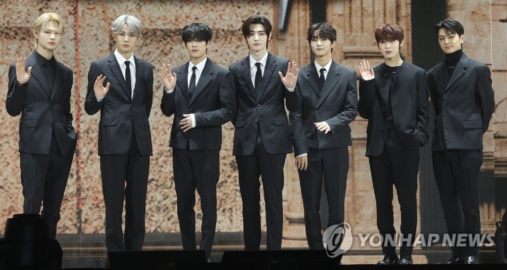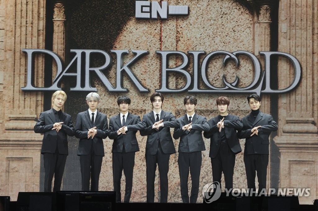 | ▲ 엔하이픈 '다크 블러드' 발매 기념 쇼케이스 (서울=연합뉴스) 강민지 기자 = 그룹 엔하이픈(ENHYPEN)이 22일 오후 서울 성북구 고려대 화정체육관에서 열린 네 번째 미니앨범 '다크 블러드(DARK BLOOD)' 발매 기념 미디어 쇼케이스에서 포즈를 취하고 있다. 2023.5.22 mjkang@yna.co.kr |