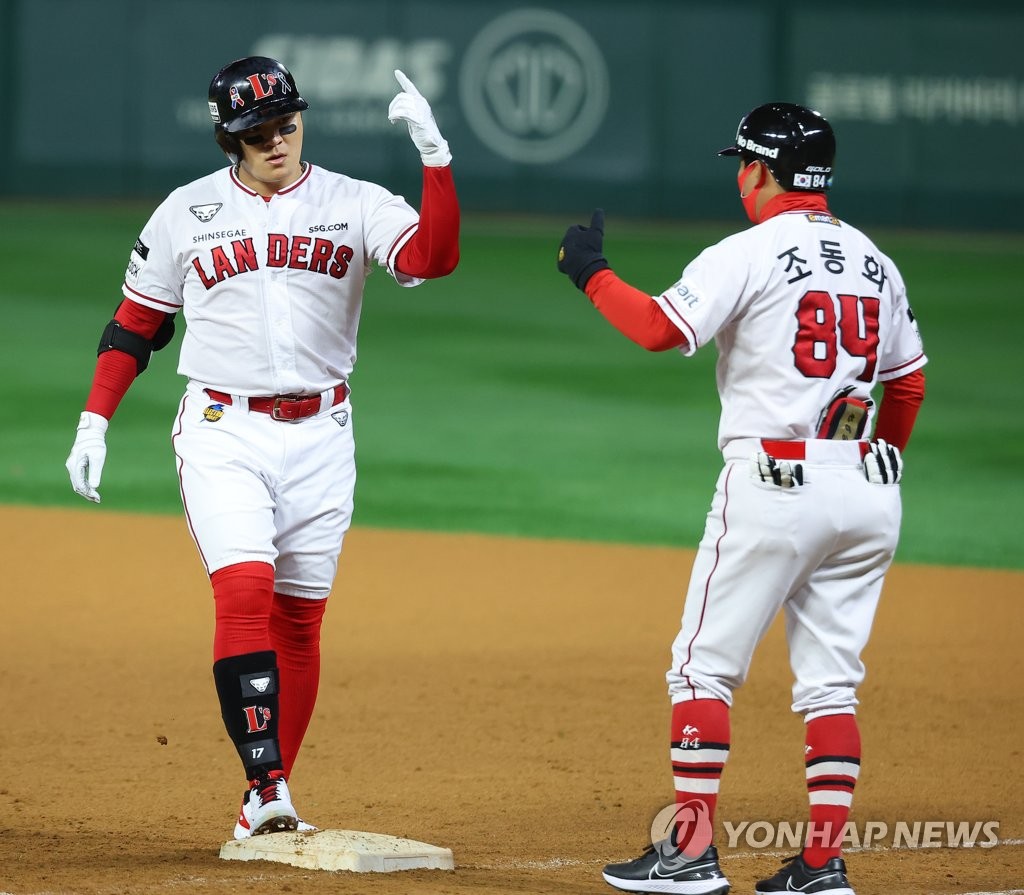 | ▲ Choo Shin-soo of the SSG Landers (L) celebrates his single against the Kiwoom Heroes during the bottom of the seventh inning of Game 1 of the Korean Series at Incheon SSG Landers Field in Incheon, 30 kilometers west of Seoul, on Nov. 1, 2022. (Yonhap) |