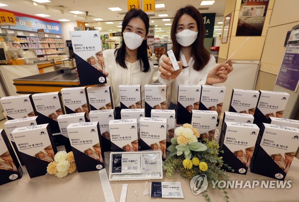 Self-test kits by two local drugmakers -- Humasis Inc. and SD Biosensor Co. -- have been sold at local pharmacies after receiving approval for emergency use last month, and they have hit shelves of supermarkets and convenience stores to provide easier access to the public.