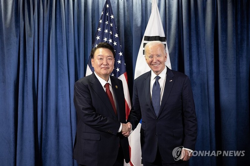 | ▲ President Yoon Suk Yeol (L) and U.S. President Joe Biden pose ahead of their talks on the sidelines of the Asia Pacific Economic Cooperation summit in Lima, Peru, on Nov. 16, 2024. (Pool photo) (Yonhap) |