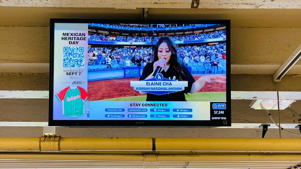 | ▲ '한국의 밤' 행사를 맞아 한인 가수가 애국가를 부르는 장면 (로스앤젤레스=연합뉴스) 정윤섭 특파원 = 19일(현지시간) LA 다저스타디움에서 열린 '한국의 밤' 행사에서 한인 동포가 애국가를 부르고 있다. 2022.08.20 jamin74@yna.co.kr |