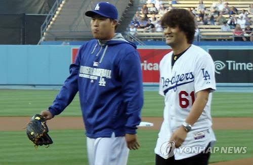 | ▲ 2014년 LA 다저스타디움에서 시구한 박찬호(오른쪽)와 공을 받은 류현진(왼쪽) [연합뉴스 자료사진. 재판매 및 DB 금지] |