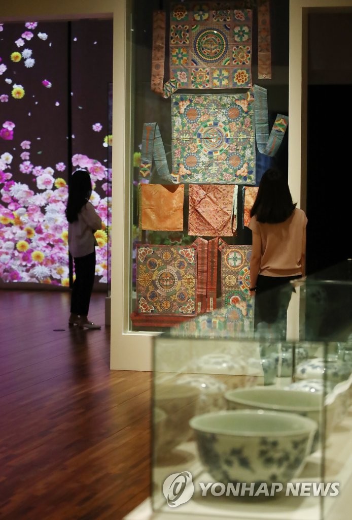 전시실 일부에서는 창덕궁 낙선재 문살 장식을 벽면에 연출하고 천장에서 나오는 빛 아래에 유물을 배치했다. 혼례복 꽃무늬를 활용한 미디어 아트도 선보였다.