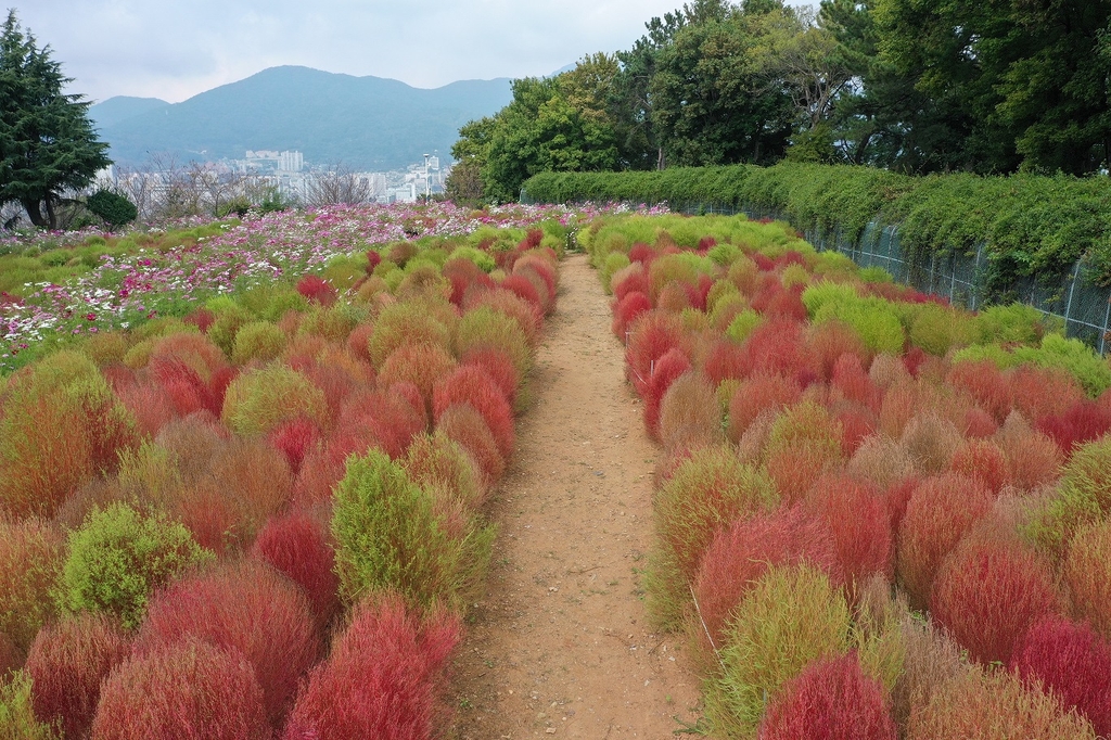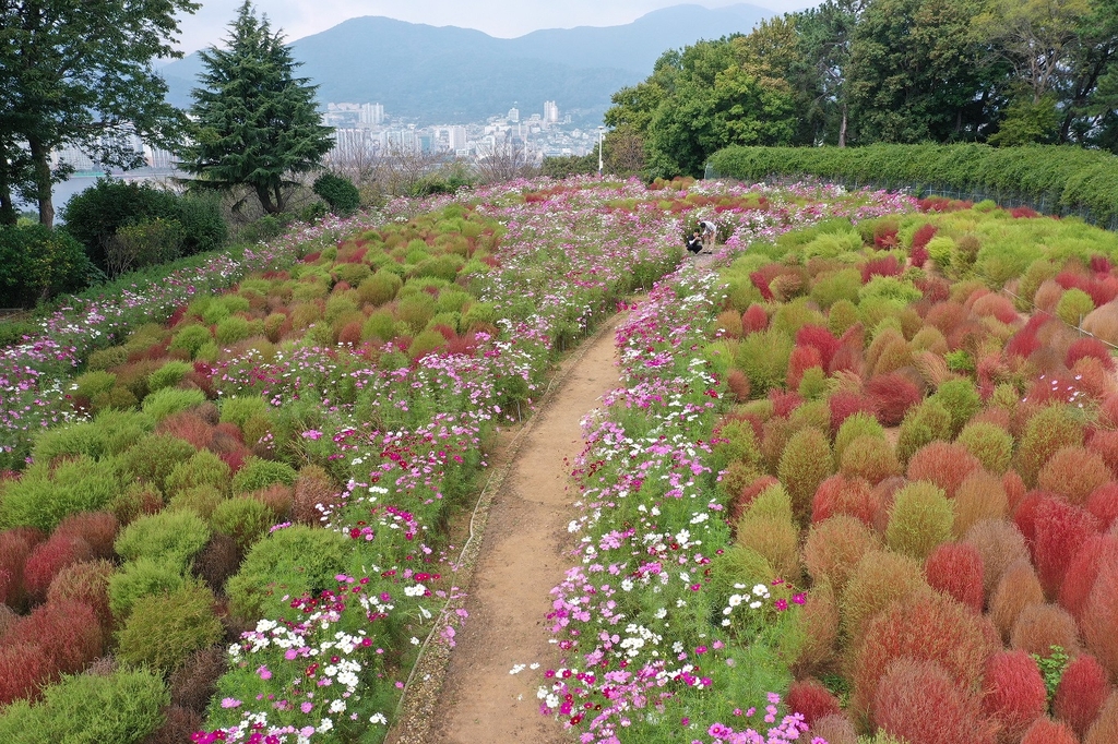 (창원=연합뉴스) 경남 창원시 마산합포구 돝섬 해상유원지에 푸른 바다를 배경으로 가을꽃들이 만발해 있다.