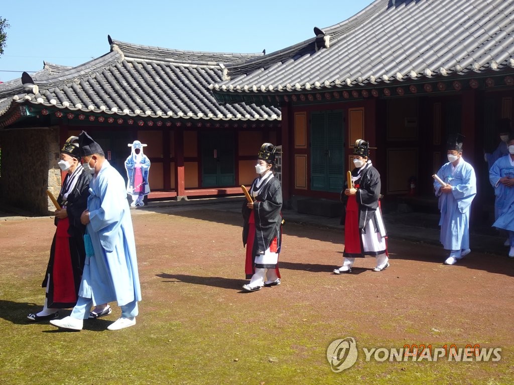 | ▲ 여성 최초 참여한 탐라개벽신위제 (제주=연합뉴스) 6일 제주시 삼성혈에서 '탐라개벽신위제'가 봉행되고 있다. 제관인 양경주 고·양·부삼성사재단 이사(맨 앞줄 왼쪽)에 이어 여성인 김선영 제주예총 회장(가운데), 오영희 제주도의회 문화관광체육위원회 부위원장(세 번째)이 제관으로 제향에 참여하고 있다. 여성이 제향에 참여한 것은 삼성혈에서 제례를 시작한 1526년 이후 처음 있는 일이다. 2021.10.7 [고양부삼성사재단 제공. 재판매 및 DB 금지] koss@yna.co.kr |