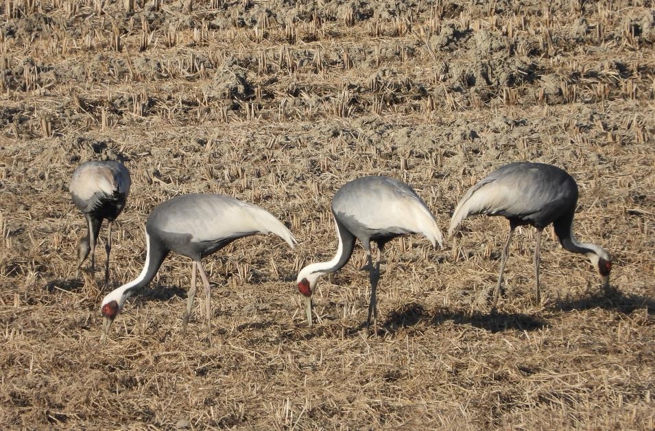 재두루미 6마리는 설이 지난 현재까지 우포늪 사지포 일대를 중심으로 쉬거나 논바닥을 뒤지며 먹이를 찾는 등 월동 중이다.