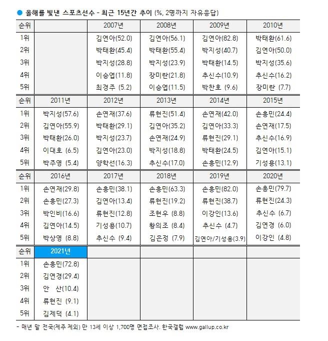 | ▲ 2021년을 빛낸 스포츠선수 상위 10위 [한국갤럽 제공. 재판매 및 DB 금지] |
