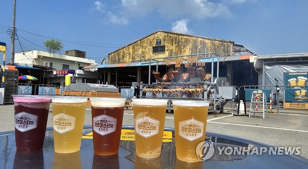 | ▲ 예산 맥주페스티벌 (예산=연합뉴스) 충남 예산군은 백종원 더본코리아 대표와 함께 다음 달 1∼3일 예산시장 일대에서 '2023 예산 맥주 페스티벌'을 개최한다고 18일 밝혔다. 페스티벌에서는 예산사과 애플리어, 제주감귤 오름, 상주꿀배 버블, 영동포도 버블 등 지역 농특산물을 활용한 맥주와 통돼지바베큐 등을 선보인다. 사진은 이날 예산시장 앞에 등장한 지역 맥주들. 2023.8.18 [예산군 제공. 재판매 및 DB 금지] soyun@yna.co.kr |