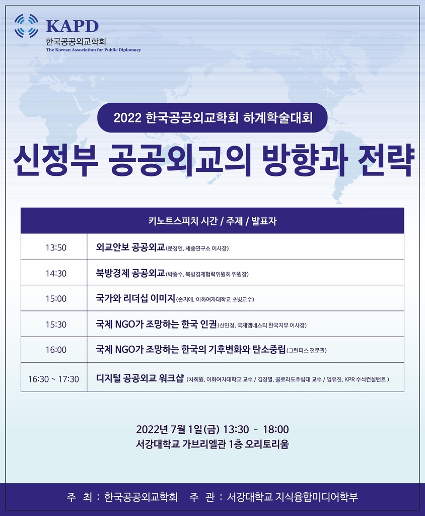 (서울=연합뉴스) 강성철 기자 = 한국공공외교학회(회장 신호창)는 7월 1일 서강대 가브리엘관 오리토리움에서 '신정부 공공외교의 방향과 전략'을 주제로 콘퍼런스를 개최한다고 30일 밝혔다.