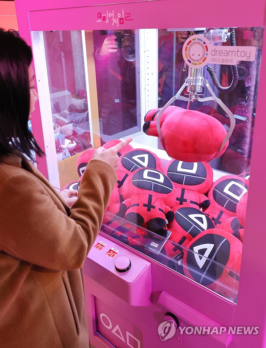 | ▲ '오징어게임 핑크솔저 인형뽑기' (서울=연합뉴스) 이재희 기자 = 9일 오전 서울 중구 동대문디자인플라자(DDP)에 열린 넷플릭스 시리즈 '오징어 게임 시즌2' 체험존에서 취재진이 인형뽑기 체험을 하고 있다. 2024.12.9 scape@yna.co.kr |