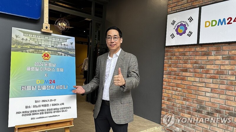 | ▲ 예태우 대표, 베트남 글로벌 이커머스 포럼 참석 (하노이=연합뉴스) 이세영 기자 = 25일 (현지시각) 베트남 하노이 시내에 위치한 교민기업 DDM24 사옥에서 열린 '2024 베트남 글로벌 이커머스 포럼 X 베트남 진출전략 세미나' 입구에서 예태우 DDM24 대표가 포즈를 취하고 있다. 포럼은 베트남 산업통상부와 DDM24가 공동 주관하며 우리나라 지자체 및 중소기업 베트남 진출에 관한 다양한 프로그램으로 27일까지 열릴 예정이다. 2024.11.25 seva@yna.co.kr |