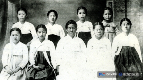 | ▲ 3·1만세운동 참여 학생들 사이의 '식모' 수피아여학교 학생들인 1919년 광주 만세운동에 참여해 옥고를 치른 후 찍은 기념 사진 속에 '식모(앞둘 가운데)'라고 기록된 인물이 눈에 띈다. [독립기념관 누리집 자료. 재판매 및 DB 금지] |
