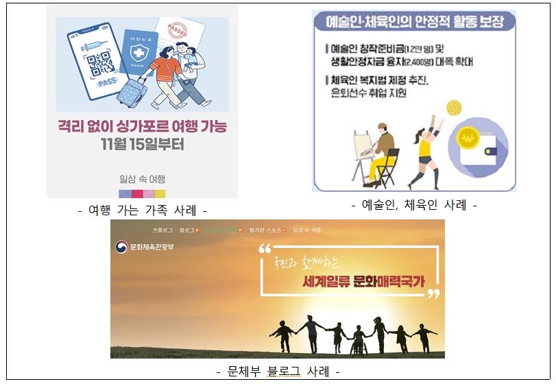 우수사례로는 여행 정보 홍보물에서 남성은 아기를 안고, 여성이 짐가방을 끌고 가는 것으로 표현해 성역할 고정관념이 없는 이미지, 예술인과 체육인 복지제도 안내 홍보물에서 남성을 예술인, 여성을 체육인으로 표현해 성별 고정관념에서 탈피한 이미지, 문체부 소개 블로그 첫 화면에 다양한 인물 유형 이미지를 사용하고 장애인을 중앙에 배치해 등장인물 대표성 균형을 살린 경우를 소개했다.