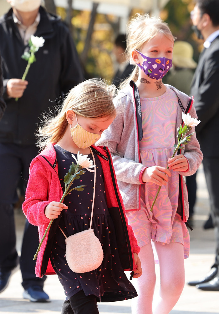 Children visit a joint memorial altar to pay tribute to the victims of a stampede in Seoul's Itaewon district near the scene of the accident on Oct. 31, 2022, that left at least 154, including 26 foreigners, killed during Halloween festivities two days ago. (Pool photo) (Yonhap)