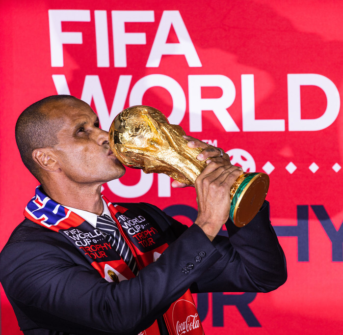 Rivaldo, former Brazil international and FIFA global ambassador, kisses the FIFA World Cup Trophy during a media showcase in Seoul on Aug. 24, 2022. (Yonhap)