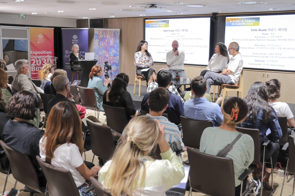 | ▲ 프랑스 파리에서 열린 '2023 K-스토리&코믹스 인 유럽' (서울=연합뉴스) 지난 6일 프랑스 파리에서 열린 '2023 K-스토리&코믹스 인 유럽' 컨퍼런스의 라운드 테이블 [한국콘텐츠진흥원 제공] |