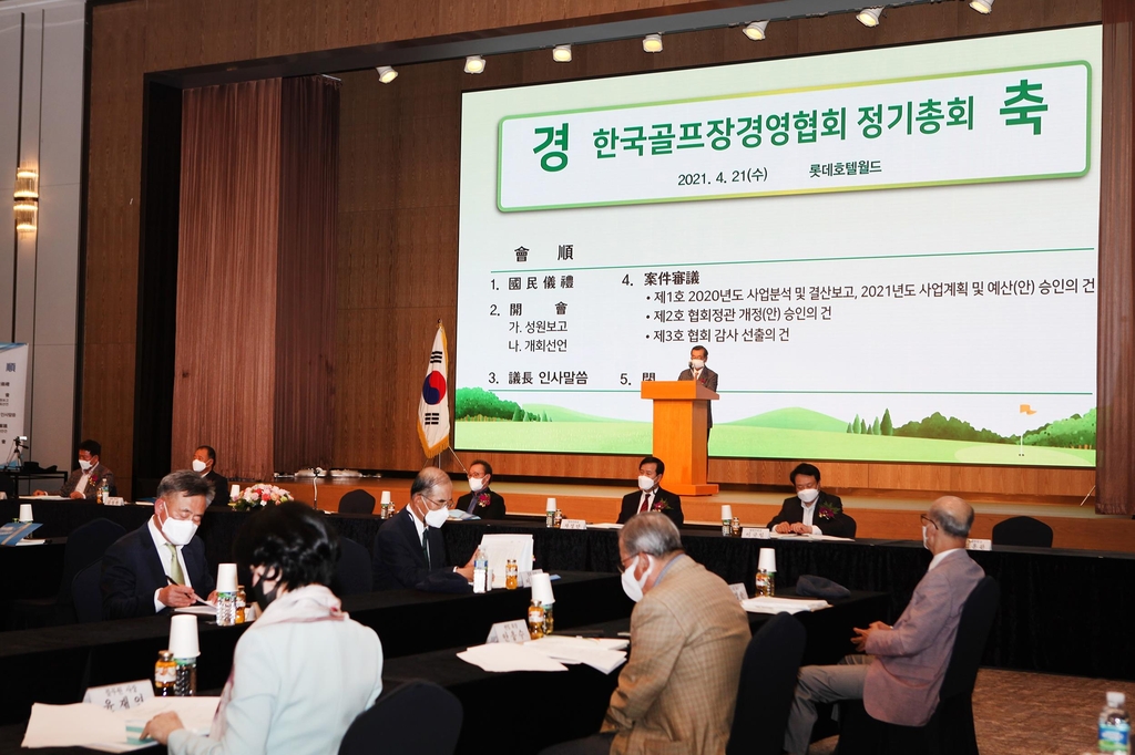 21일 오후 서울 송파구 잠실동 롯데호텔월드에서 2021년 정기총회를 개최한 골프장경영협회는 개별소비세 폐지 행정 소송 등 불합리한 골프장 관련 제도를 개선 활동과 골프장에서 신종 코로나바이러스 감염증(코로나19) 확산을 막기 위한 철저한 방역과 함께 ESG 경영 도입을 올해 중점 추진 사업으로 결정했다.