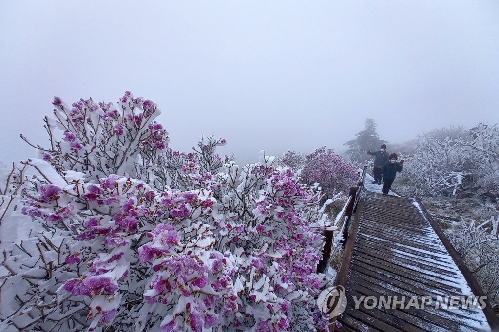 | ▲ This photo provided by Gurye County shows the snow covered azalea flowers located at Jirisan Mountain. (PHOTO NOT FOR SALE) (Yonhap) |