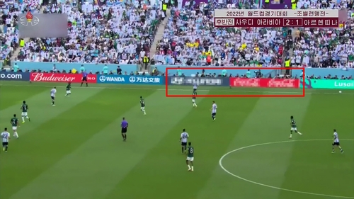 | ▲ 북한, 2022 카타르 월드컵 중계하며 현대·코카콜라 광고 모자이크 (서울=연합뉴스) 조선중앙TV는 23일 2022 카타르 월드컵 조별리그 C조 1차전의 사우디아라비아 대 아르헨티나 경기 일부를 녹화 중계했다. 사진은 현대와 코카콜라 광고판만 모자이크한 모습. [조선중앙TV 화면] 2022.11.22 [국내에서만 사용가능. 재배포 금지. For Use Only in the Republic of Korea. No Redistribution] |