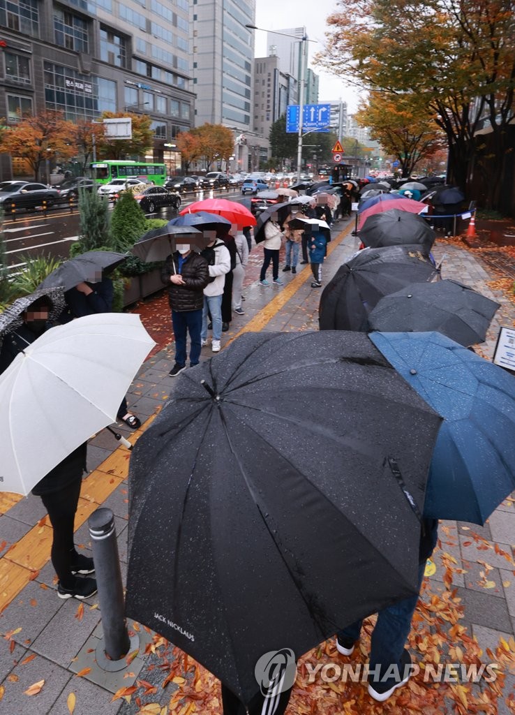 | ▲ People holding umbrellas in the rain wait in line to take tests at a COVID-19 testing station in Seoul on Nov. 8, 2021, when the country reported 1,760 new cases. (Yonhap) |