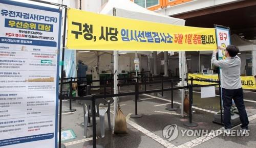 | ▲ An official of Dongjak-gu Office in Seoul puts up a sign on April 29, 2022, stating that the district office's temporary COVID-19 testing booth will close down on May 1. (Yonhap) |