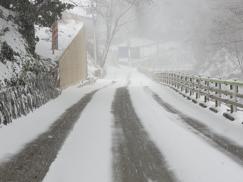 눈 세상으로 변한 울릉도…열선 깔린 도로 효과 '톡톡'
