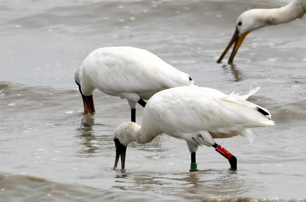 (신안=연합뉴스) 조근영 기자 = 전남 신안군은 유네스코 세계자연유산인 신안갯벌의 생물자원 모니터링 중 가락지를 부착한 국제 멸종위기종인 저어새 5개체와 노랑부리저어새 1개체를 확인했다고 27일 밝혔다.