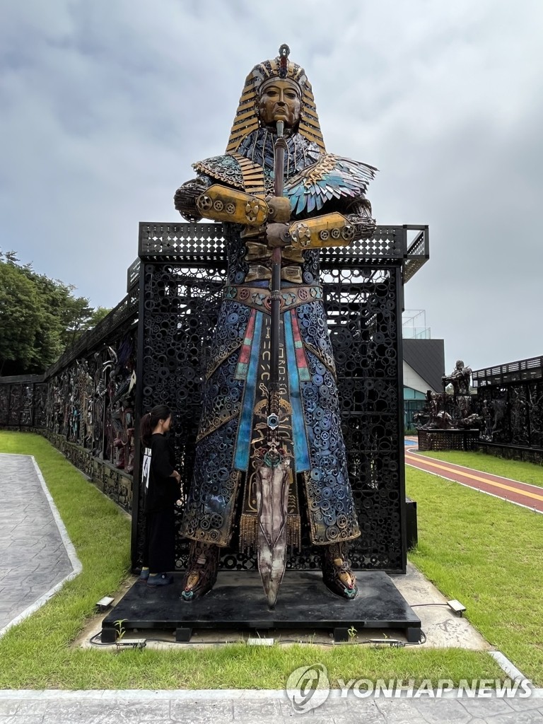 | ▲ 정크아트로 만든 파라오 (울산=연합뉴스) 울산시 울주군 서생면에 정크아트 문화예술 복합공간 FE-1 갤러리가 다음 달 6일 개장한다. 사진은 차와 오토바이 폐부품으로 만든 파라오. 2022.7.25 [정크아트 테마파크 제공·재판매 및 DB 금지] photo@yna.co.kr |