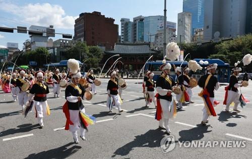 | ▲ 도심 속 사물놀이 (서울=연합뉴스) 한종찬 기자 = 8일 오전 서울 종각역 인근에서 '더케이 퍼레이드'가 펼쳐지고 있다. '2022 한국문화축제'의 일환인 이 행사에는 일반 시민 및 지역 예술단체 2천여 명이 참여했다. 2022.10.8 saba@yna.co.kr |