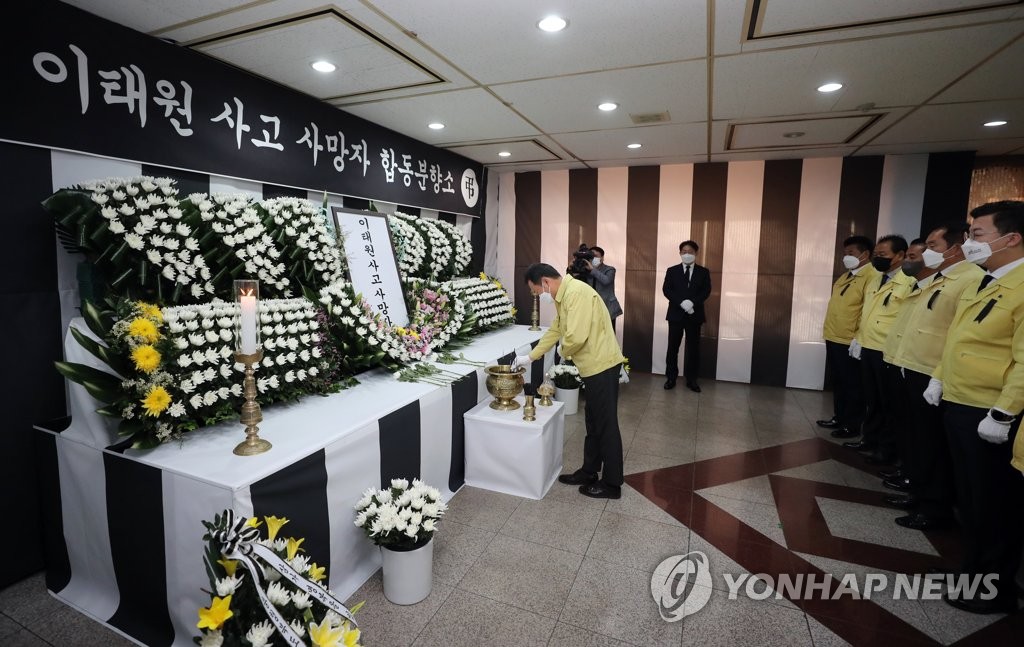 | ▲ 충북도청에 마련된 이태원 사고 사망자 합동분향소 (청주=연합뉴스) 천경환 기자 = 31일 충북도청에 설치된 서울 이태원 압사 사고 희생자 합동분향소에서 황영호 충북도의회 의장이 희생자들의 명복을 빌고 있다. 2022.10.31 kw@yna.co.kr |