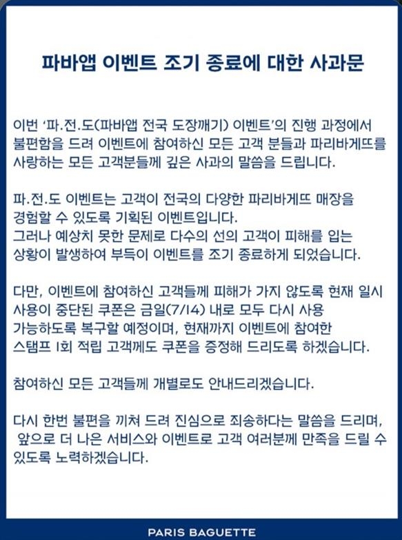 이어 "고객이 전국의 다양한 파리바게뜨 매장을 경험할 수 있도록 기획한 이벤트이지만, 예상치 못한 문제로 다수의 선의 고객이 피해를 입는 상황이 발생해 부득이 이벤트를 조기 종료하게 됐다"고 설명했다.
