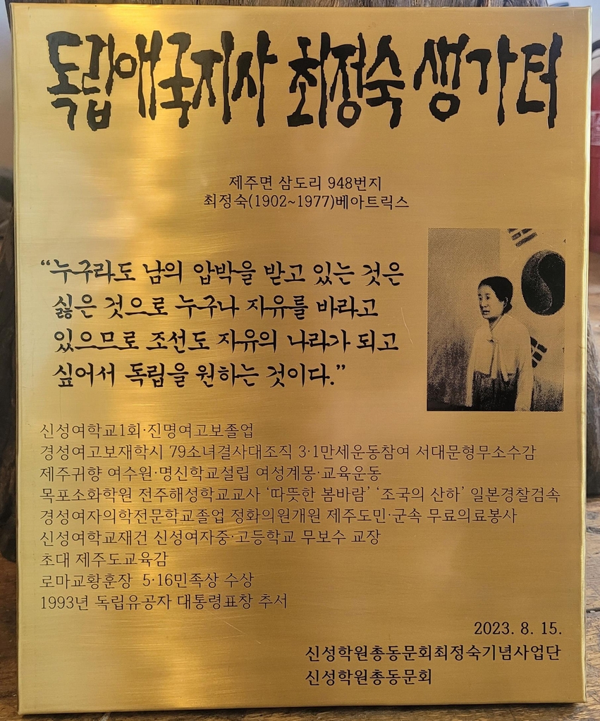 신성학원 총동문회 최정숙기념사업단은 이날 오후 제주시 삼도이동에 있는 최정숙 애국지사 생가터(제주시 관덕로 14-4) 앞에서 생가터 표지판 제막식을 열었다.