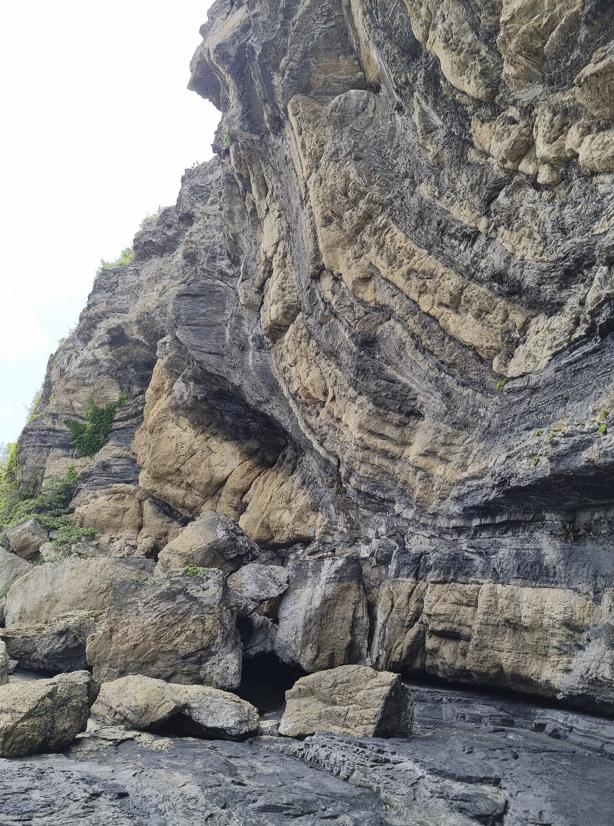 층마다 경계가 비교적 뚜렷한 지층이 쌓이고 이어져 지름이 약 40m에 달한다. 두꺼운 양탄자가 말린 것처럼 보이는 이 습곡은 푸른 바다와도 조화를 이룬다는 평가를 받는다.