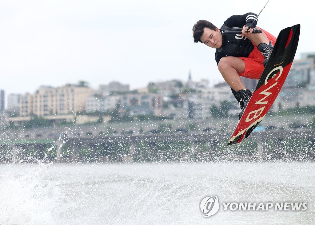 | ▲ 더위를 넘어 (서울=연합뉴스) 류영석 기자 = 전국 대부분 지역에 폭염 특보가 발효 중인 2일 오후 서울 한강 리버시티 수상스키장에서 한 시민이 웨이크보드를 타고 있다. 2023.7.2 ondol@yna.co.kr |