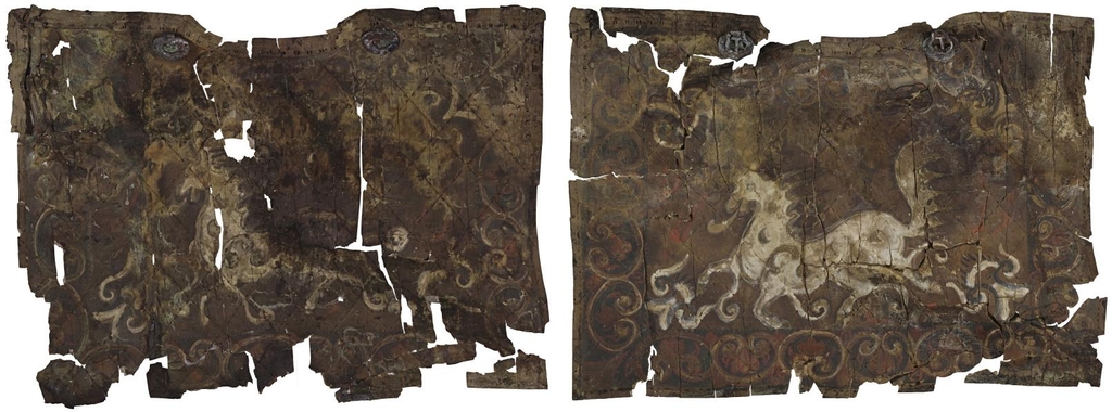 | ▲ 천마총에서 출토된 천마 그림 말다래 2점 모습 1973년 발굴 당시 위(왼쪽), 아래(오른쪽) 2점이 함께 발견된 말다래 [국립경주박물관 제공. 재판매 및 DB 금지] |