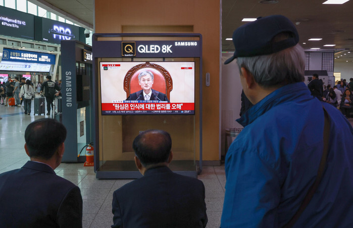 People watch a live TV broadcast at Seoul Station in the capital on May 1, 2025, about the Supreme Court's hearing to hand down a ruling on the election law violation case of the Democratic Party presidential candidate Lee Jae-myung. The court ordered the high court to reexamine Lee's acquittal on charges of election law violation. (Pool photo) (Yonhap)