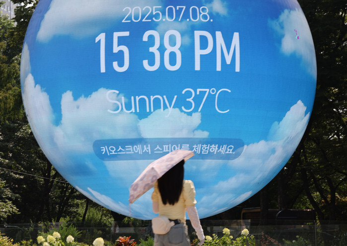 A woman walks past a structure showing that the mercury shot up to an intraday high of 37 C, in Seoul's Songpa Ward on July 8, 2025, amid heat wave warnings in many parts of the country. (Yonhap)