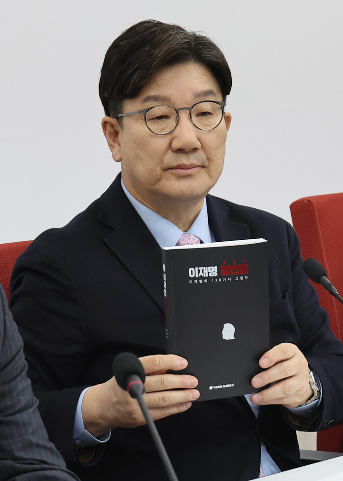 Kweon Seong-dong, floor leader of the ruling People Power Party, holds up a book that the party says collects gaffes made by Lee Jae-myung, leader of the main opposition Democratic Party, as he attends a press conference at the National Assembly in Seoul on March 21, 2025. (Yonhap)