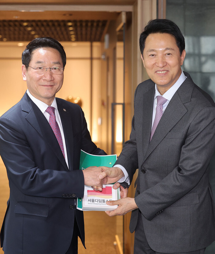 Incheon Mayor Yoo Jeong-bok (L), a lawmaker of the conservative People Power Party, and Seoul Mayor Oh Se-hoon, both affiliated with the conservative People Power Party, pose for a photo during their meeting at City Hall in the capital on April 16, 2025. Yoo has joined the party's nomination race for the June 3 presidential election to pick former President Yoon Suk Yeol's successor. (Yonhap)